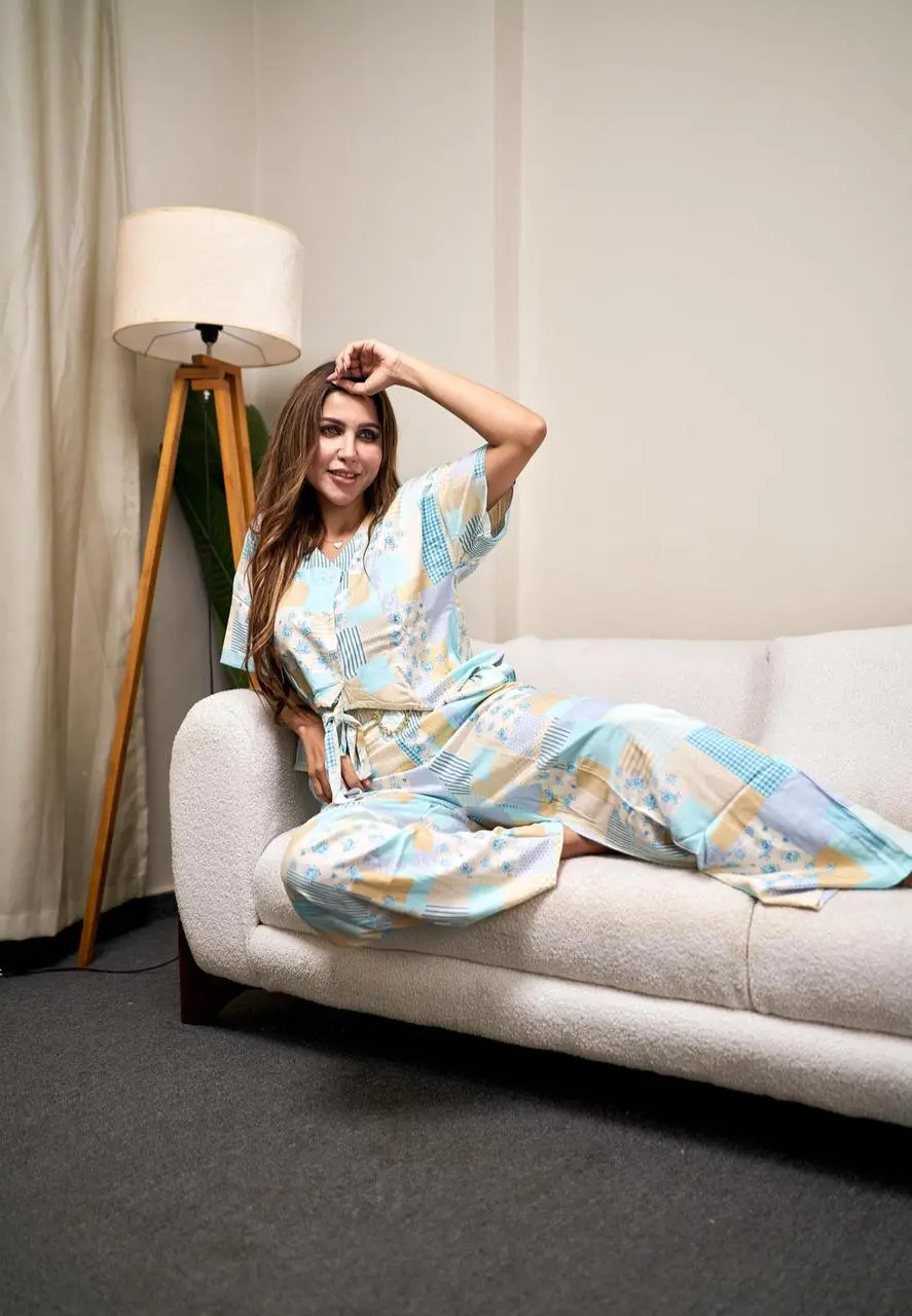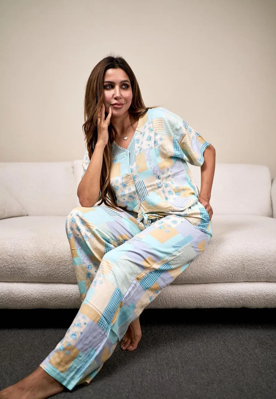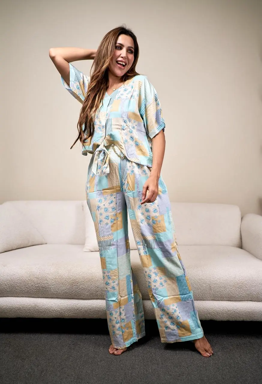 This stylish set includes full-length pants and a short-sleeve button-up shirt with a tie-front detail for a flattering and modern touch.