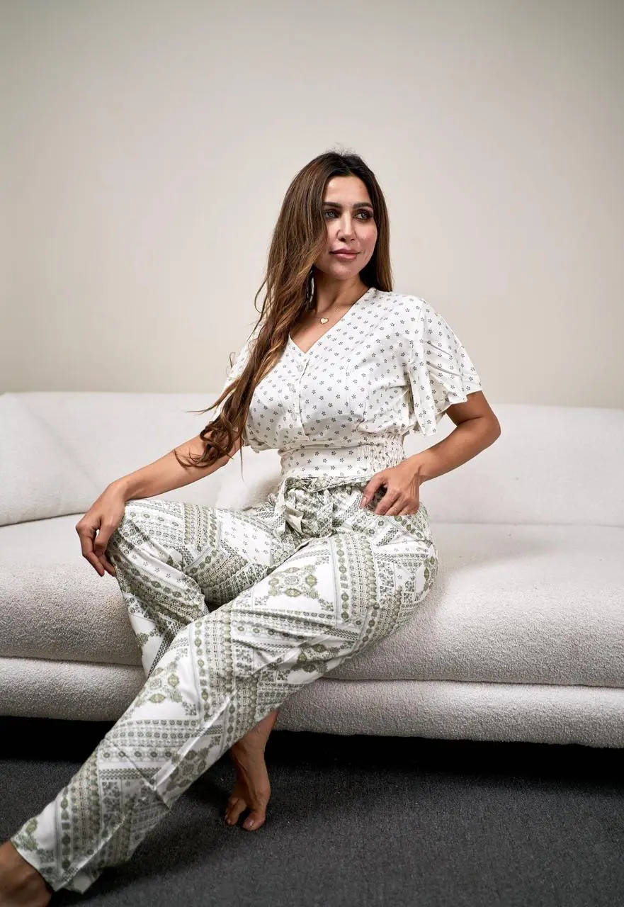 The set includes a white, short-sleeve butterfly-style top with olive polka dots, paired with matching printed pants in white and olive for a fresh, coordinated look. Available in all sizes