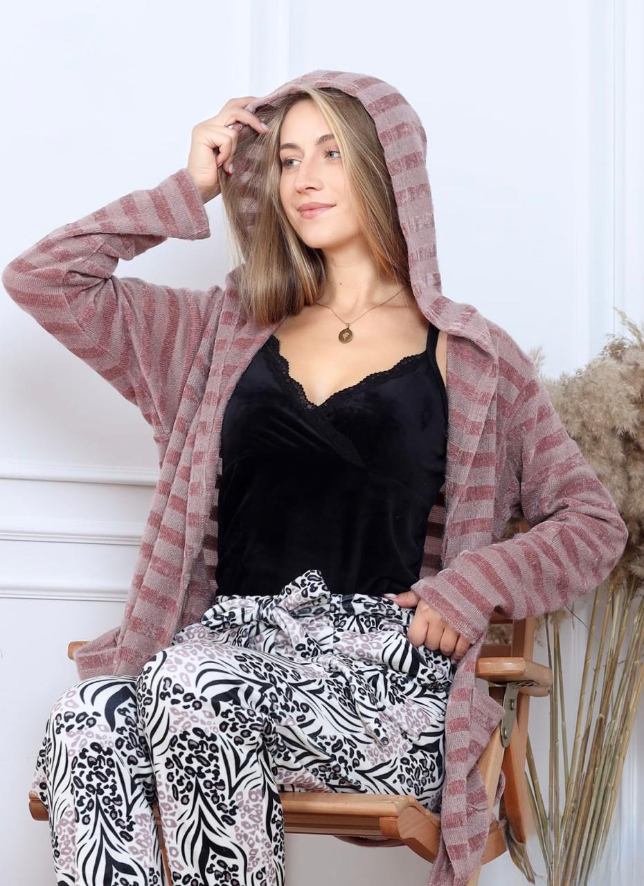 ✔ Soft Wool Robe – Enhanced with luxurious velvet trim for an elegant touch