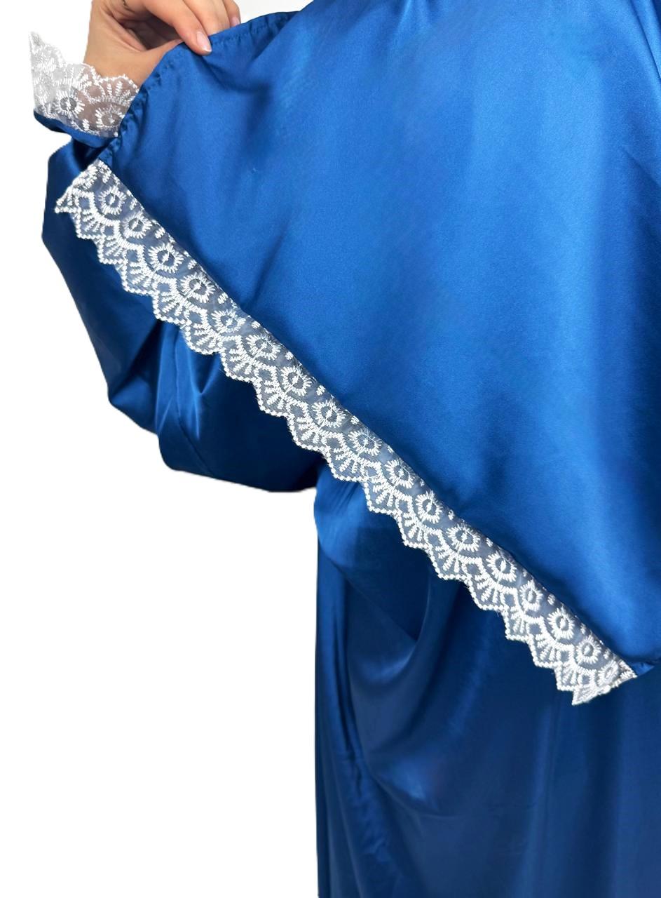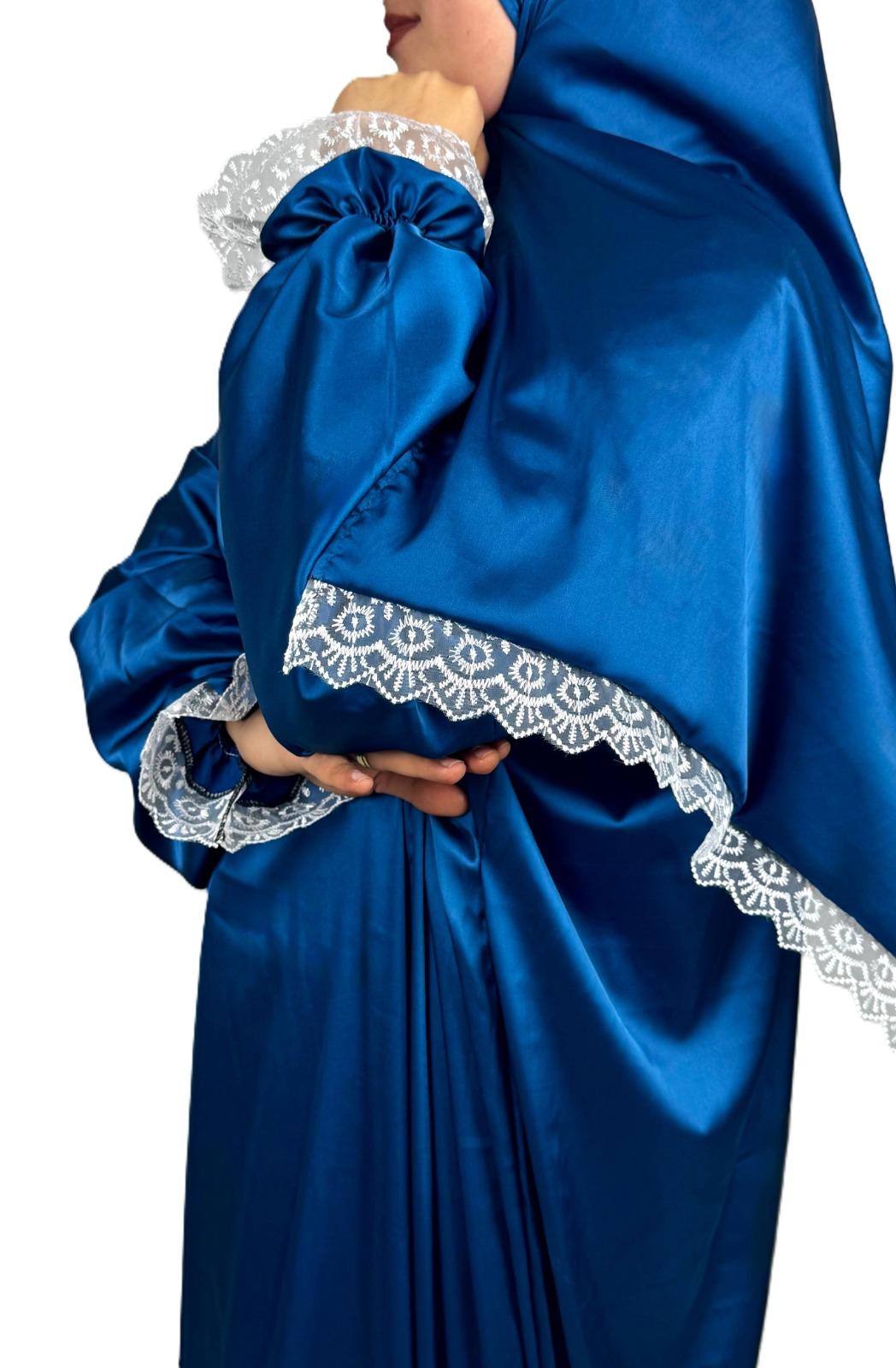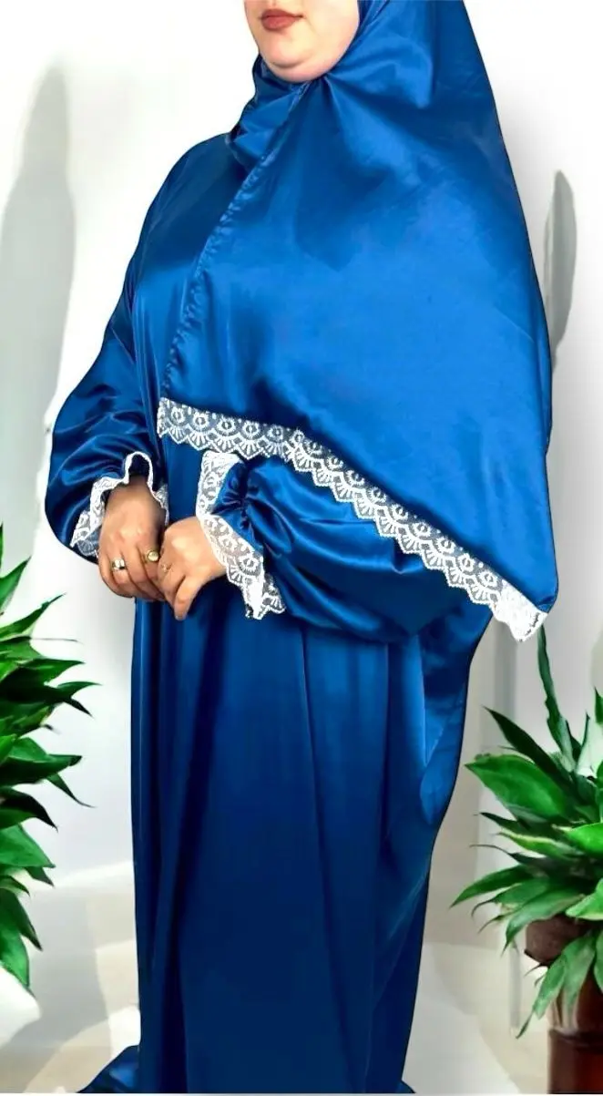 Step into elegance with this luxurious satin Isdal, designed with delicate detailing on the sleeves and hijab for a refined and graceful look. Perfect for prayer, special occasions, and home gatherings, offering both comfort and style.